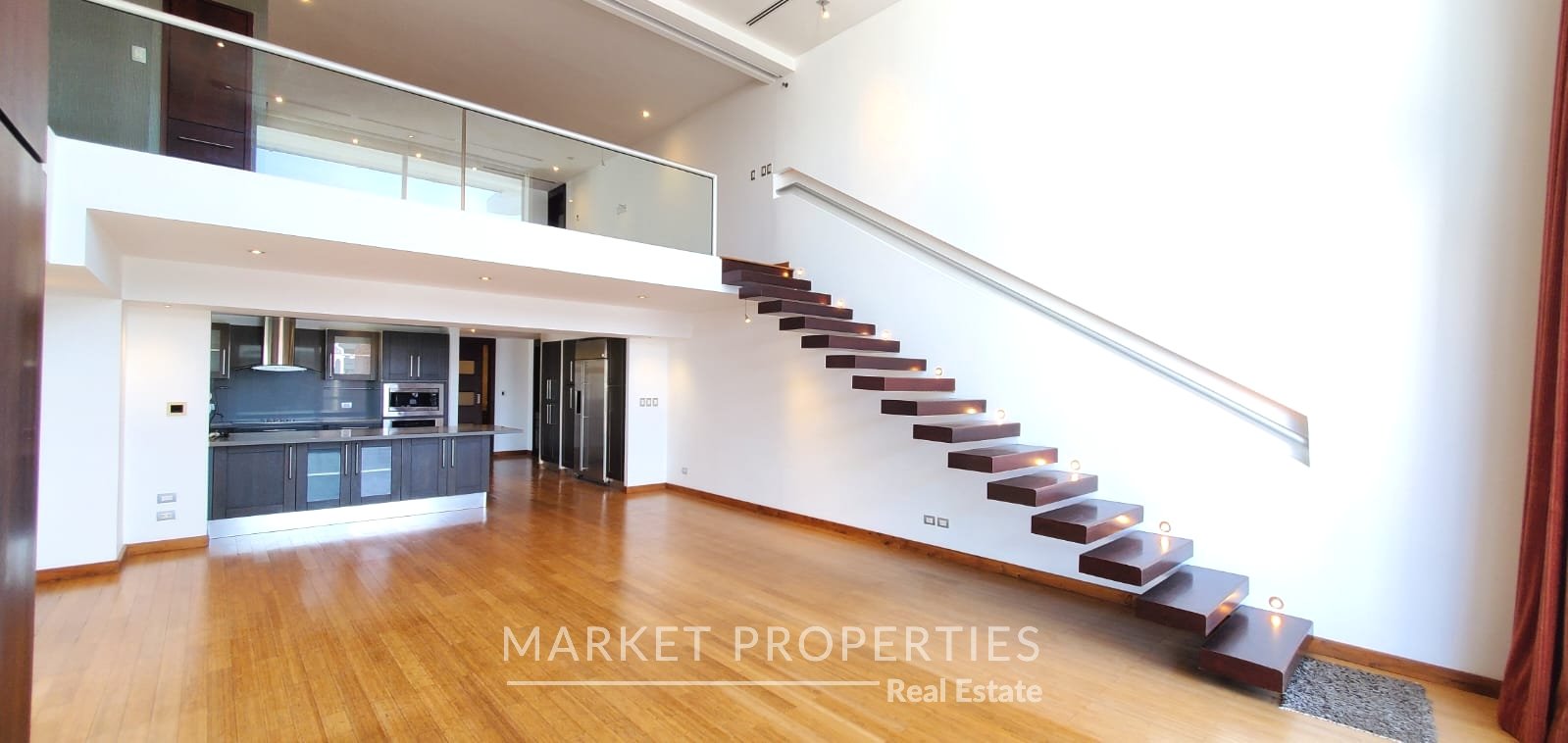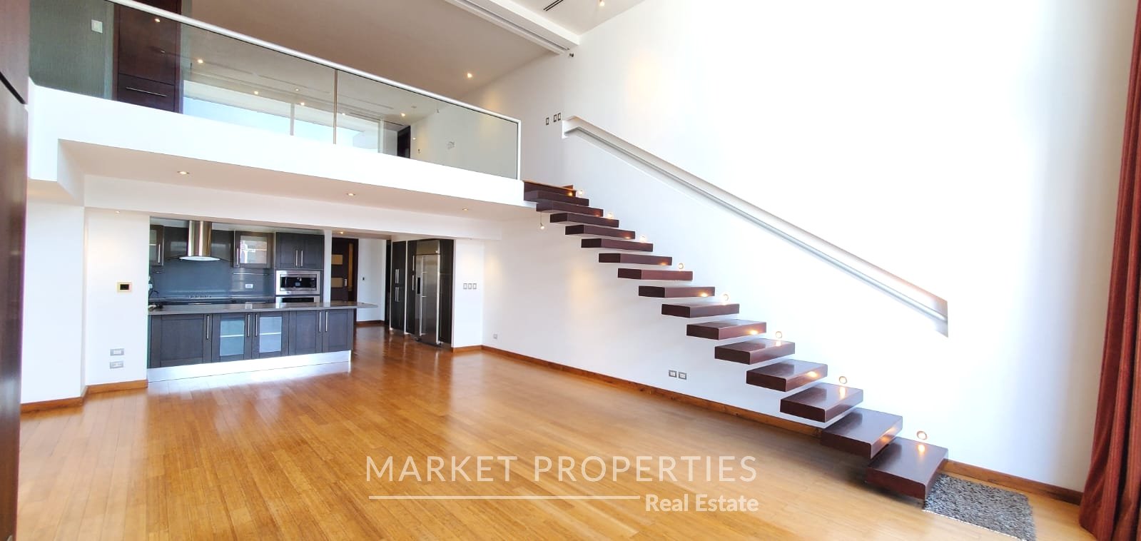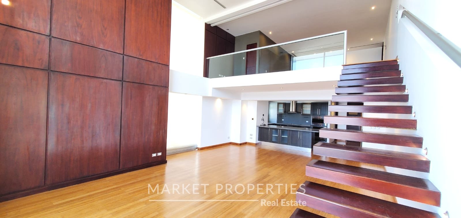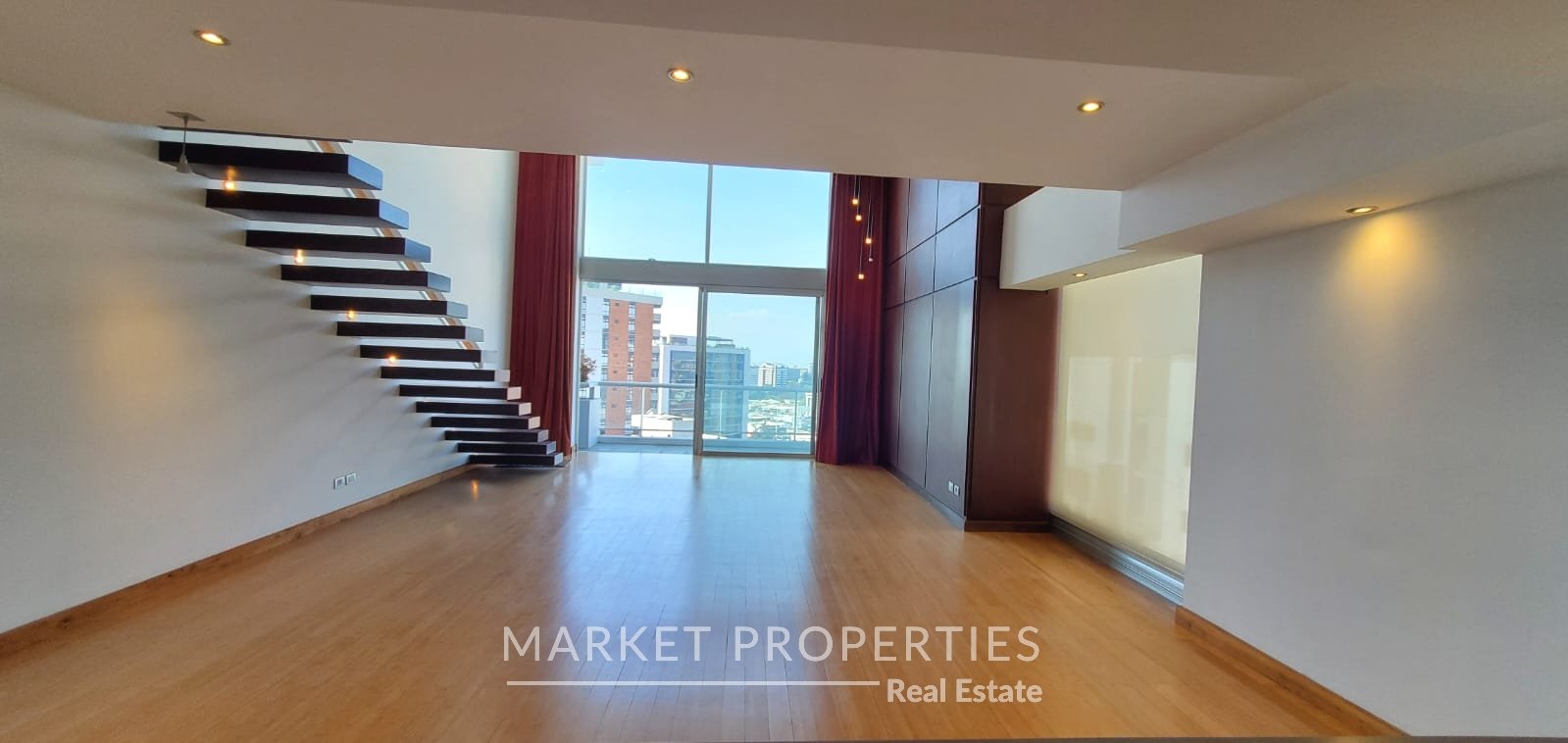 Sala, comedor, cocina equipada y balcón a doble altura.