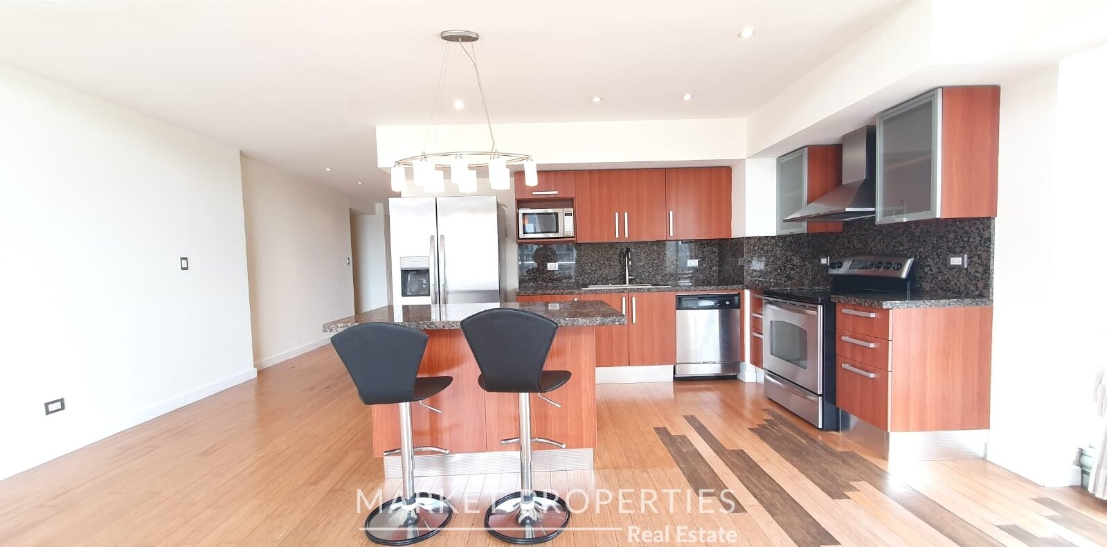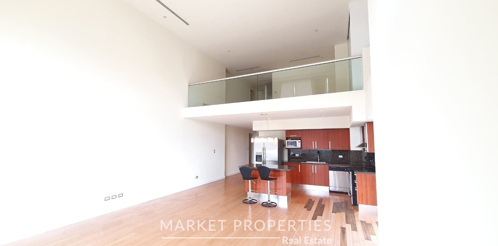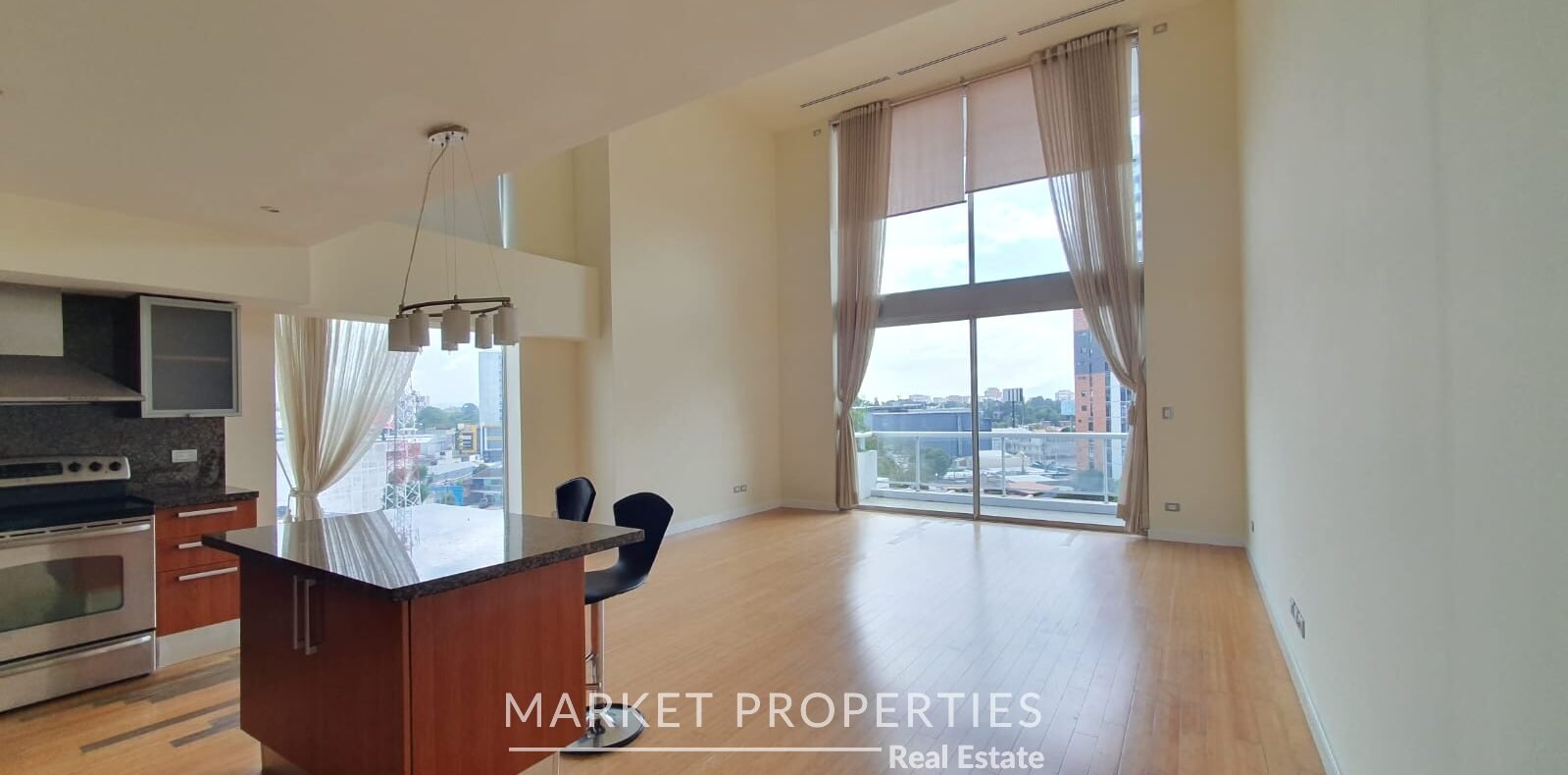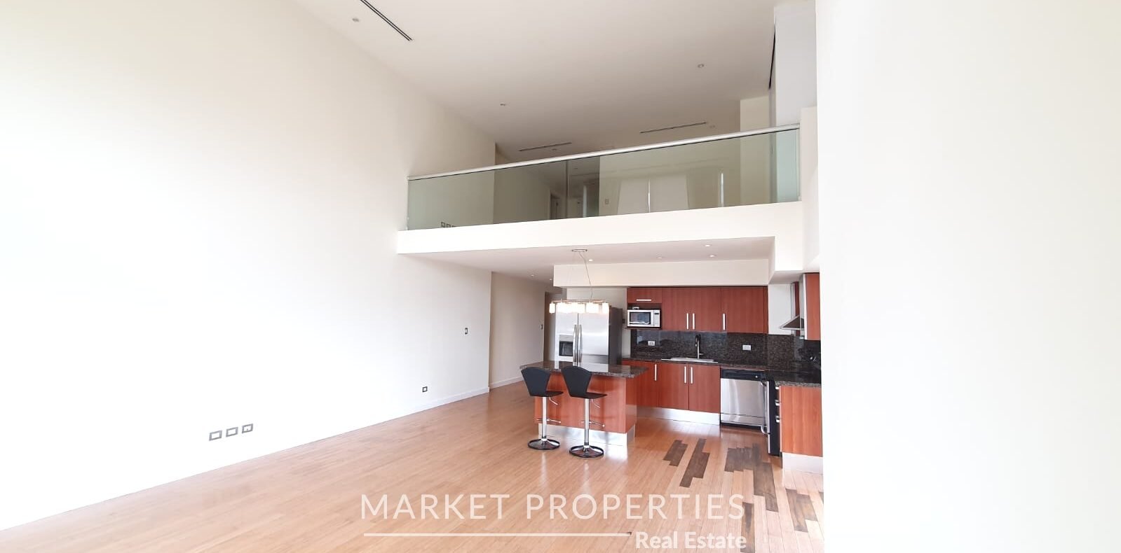 Sala y comedor a doble altura, cocina con isla, Balcón amplio, integrados.