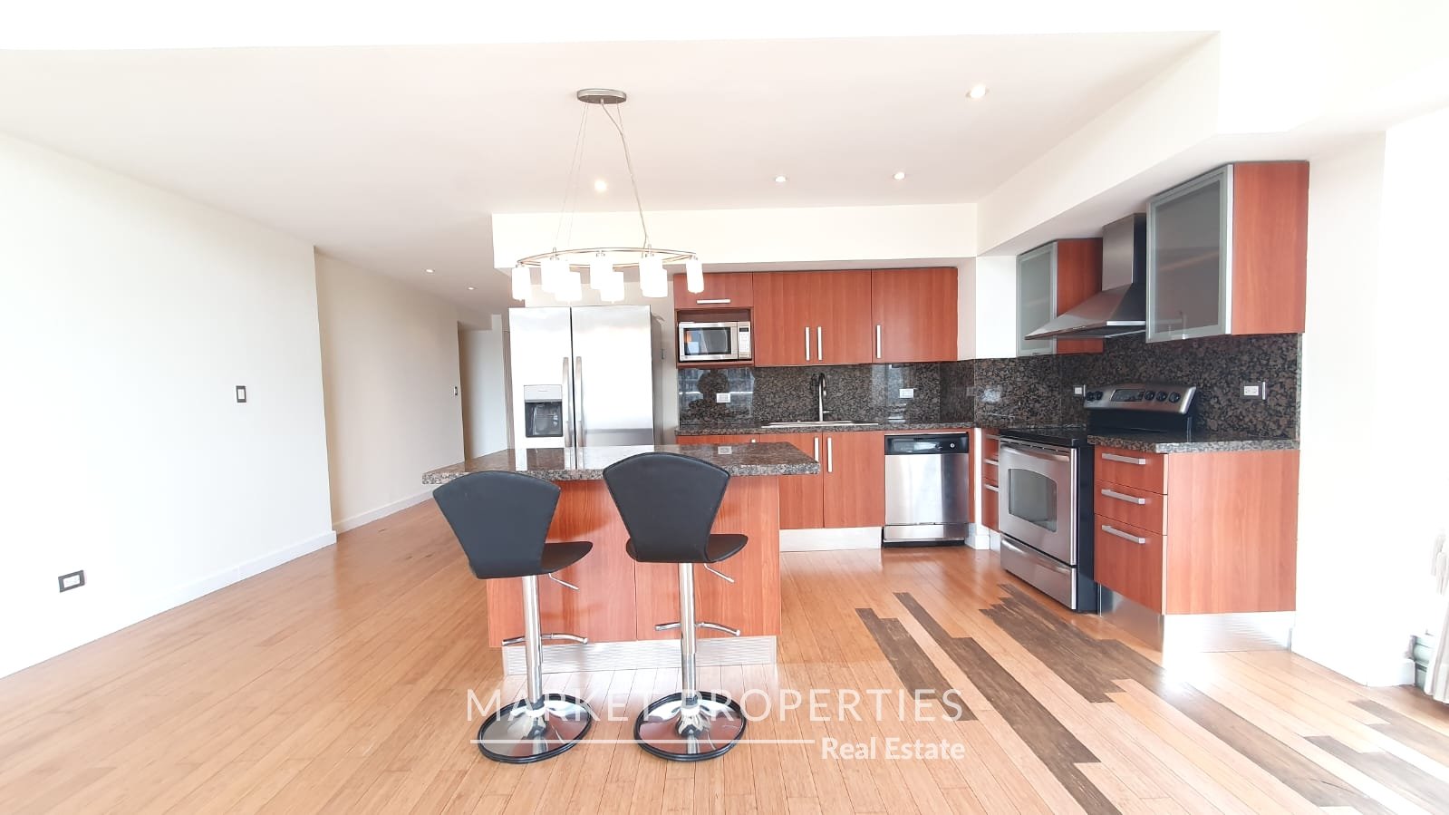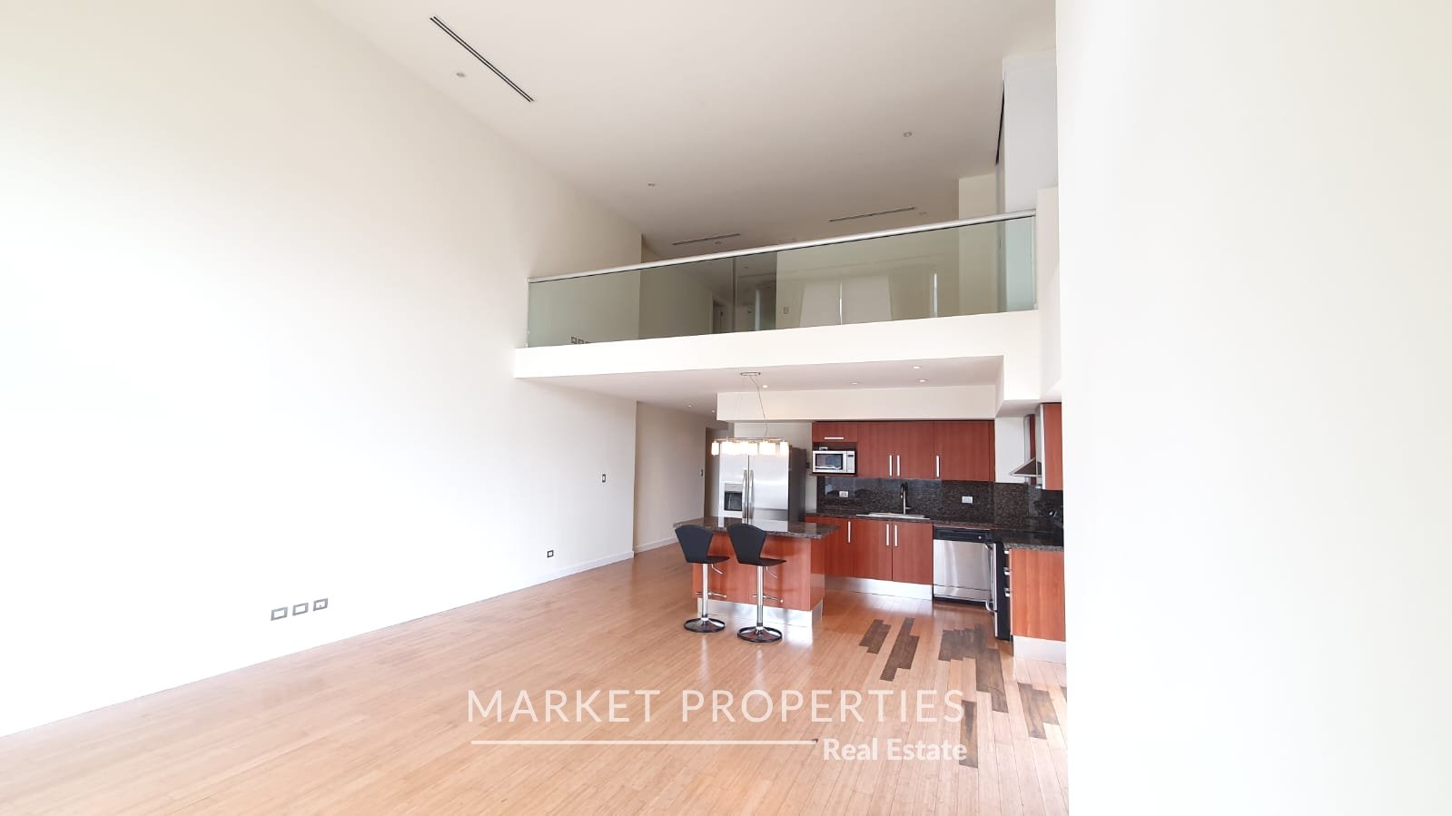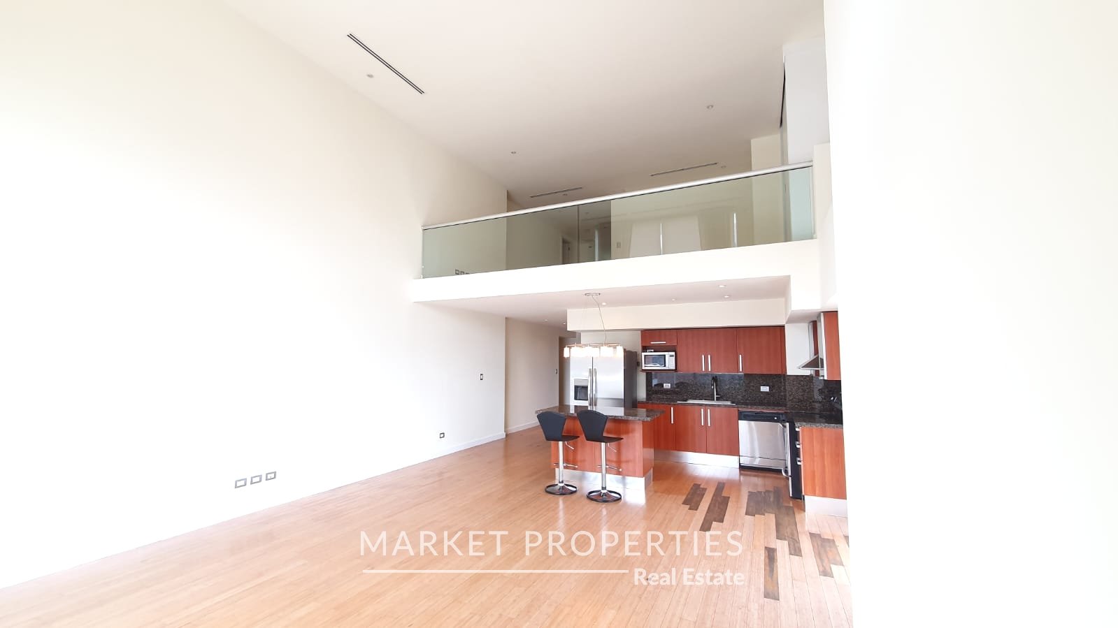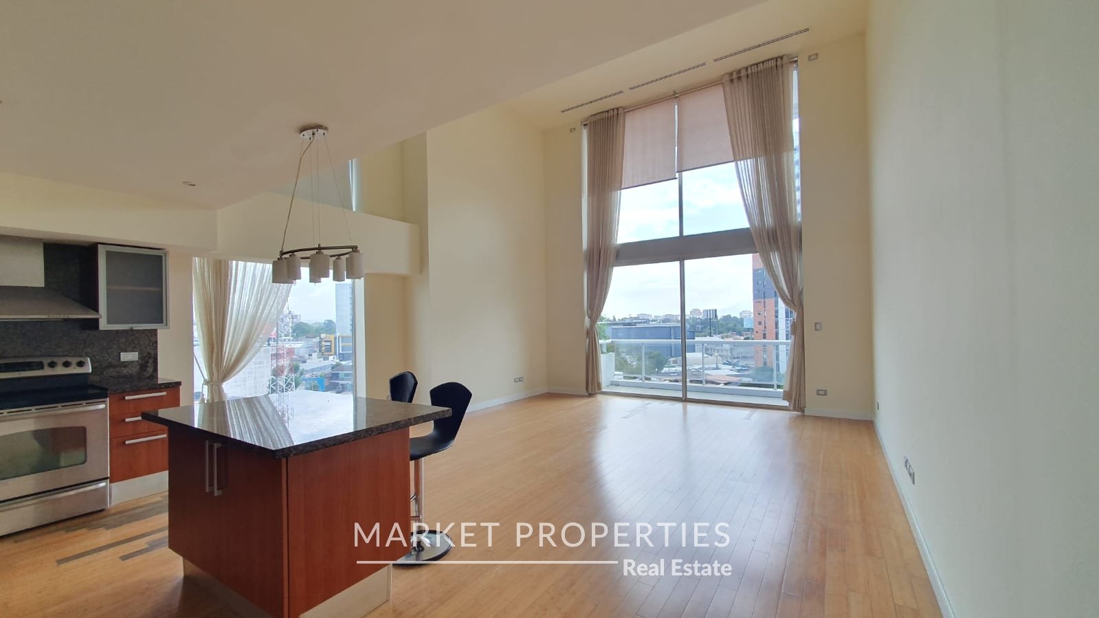 Sala y comedor a doble altura, cocina con isla, Balcón amplio, integrados.