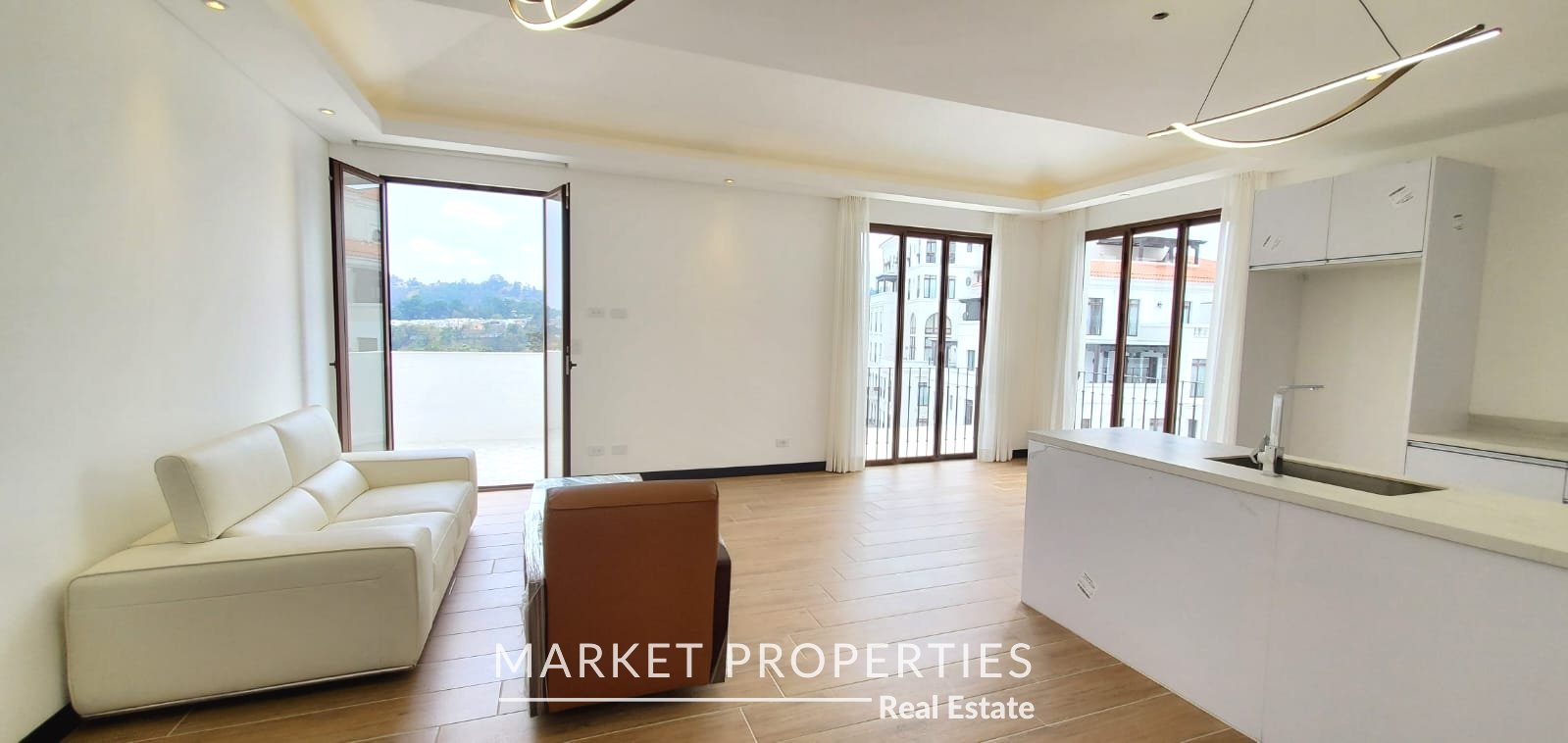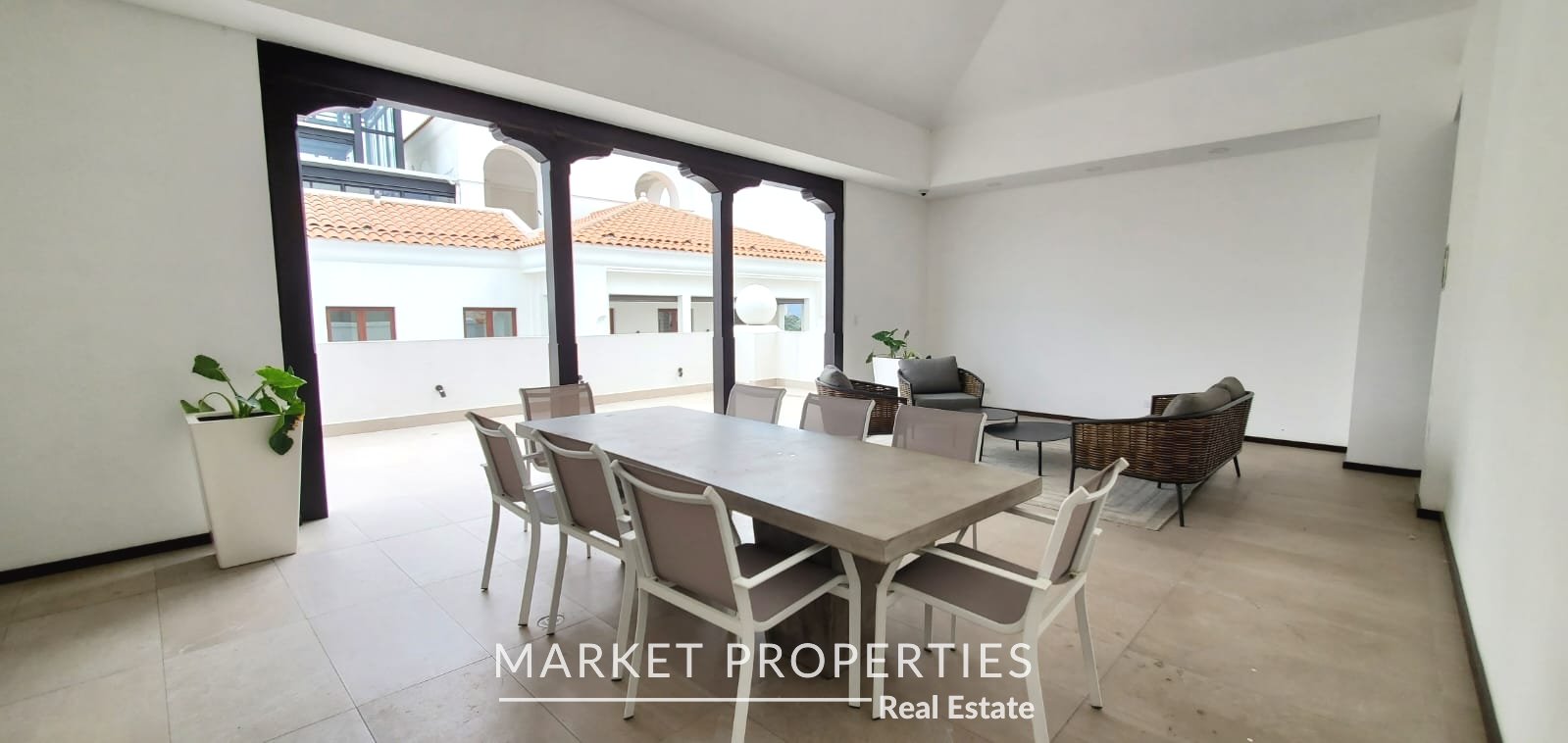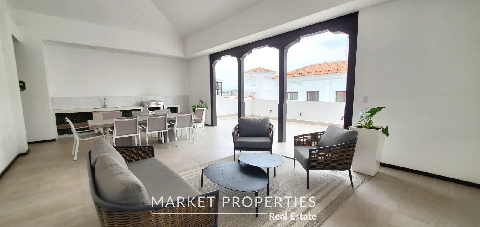 Amplia sala, comedor con cocina abierta con salida a terraza