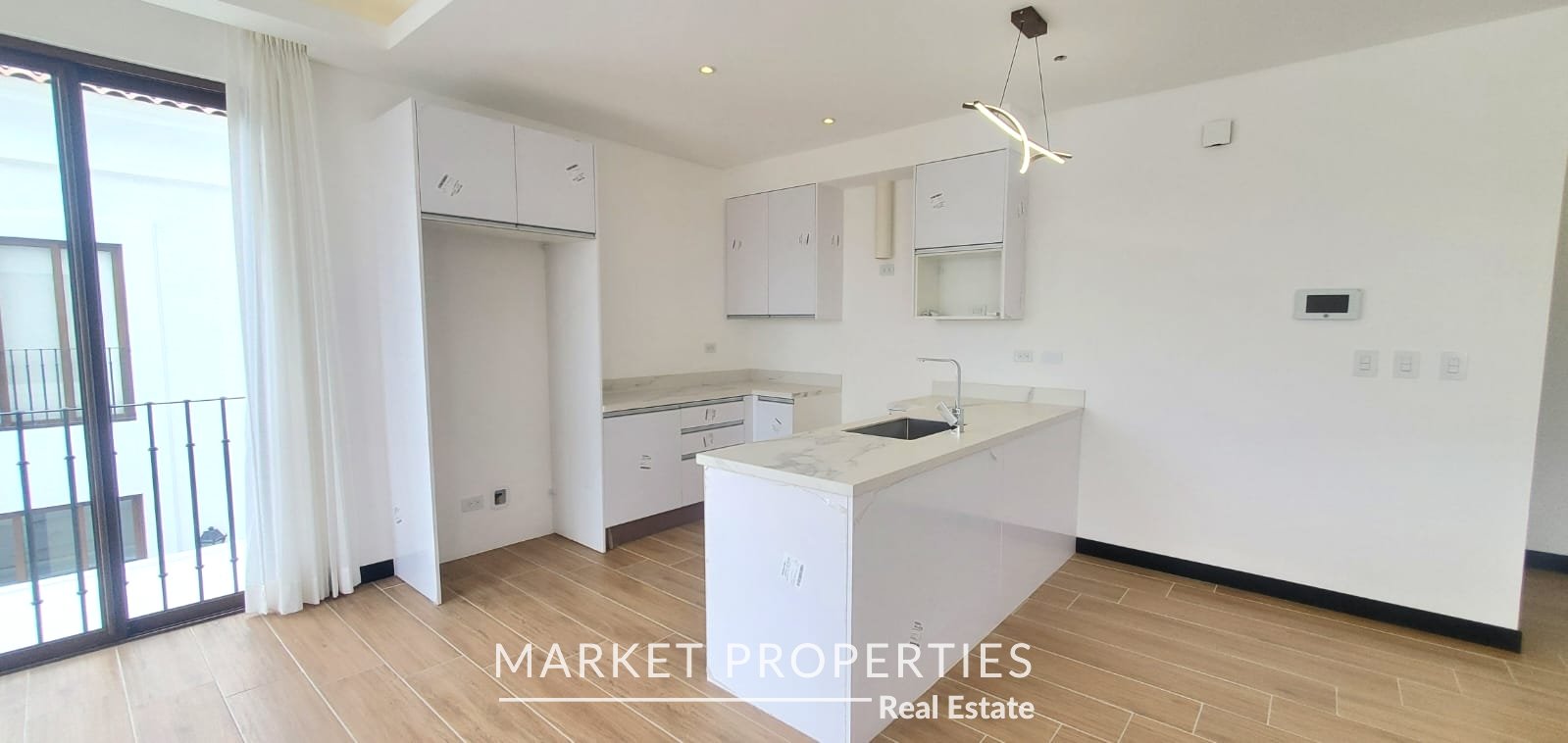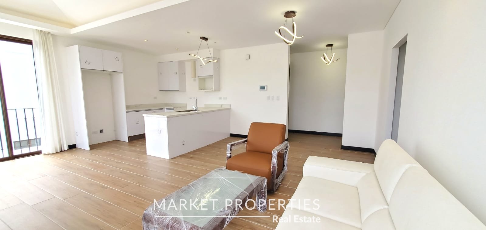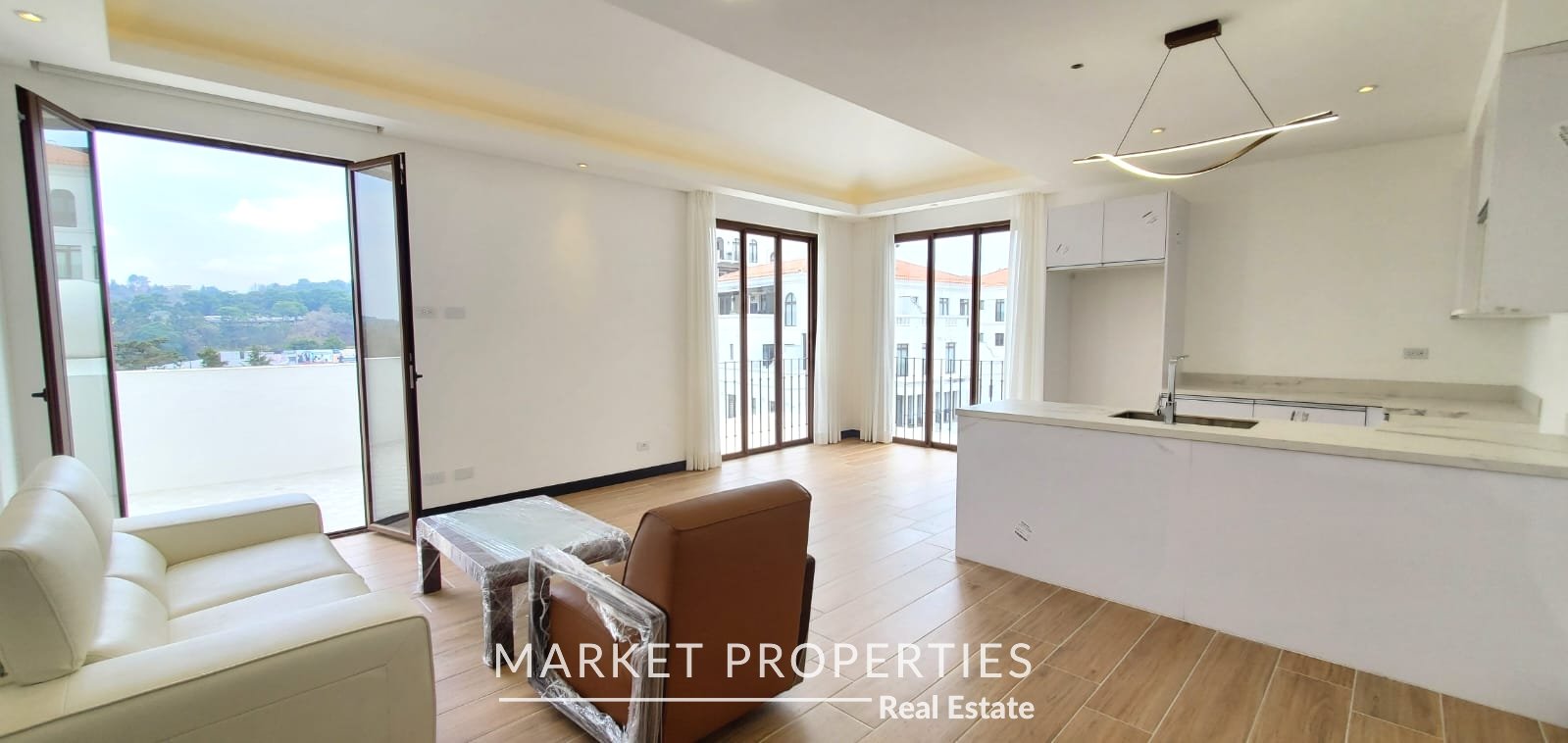 Amplia sala, comedor con cocina abierta con salida a terraza