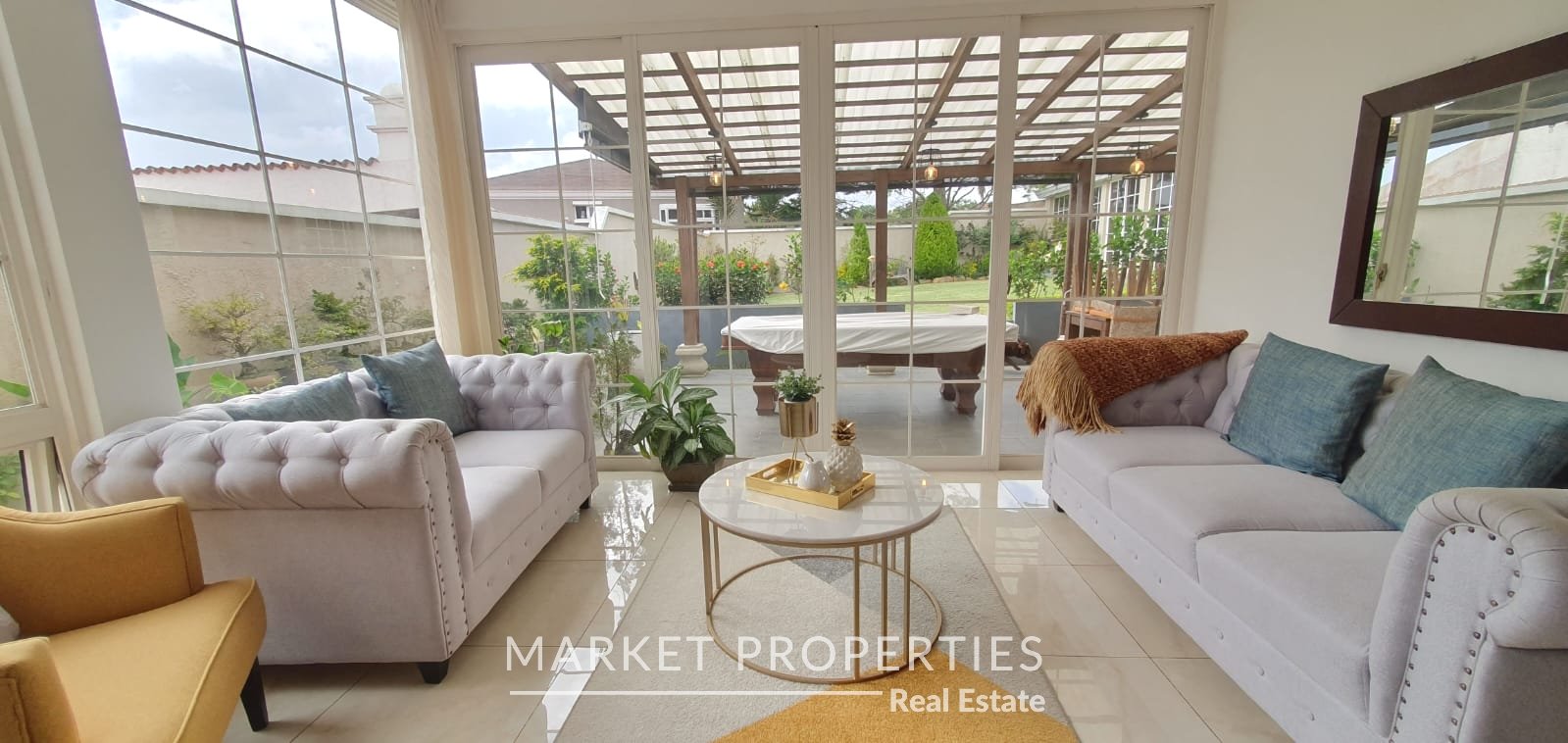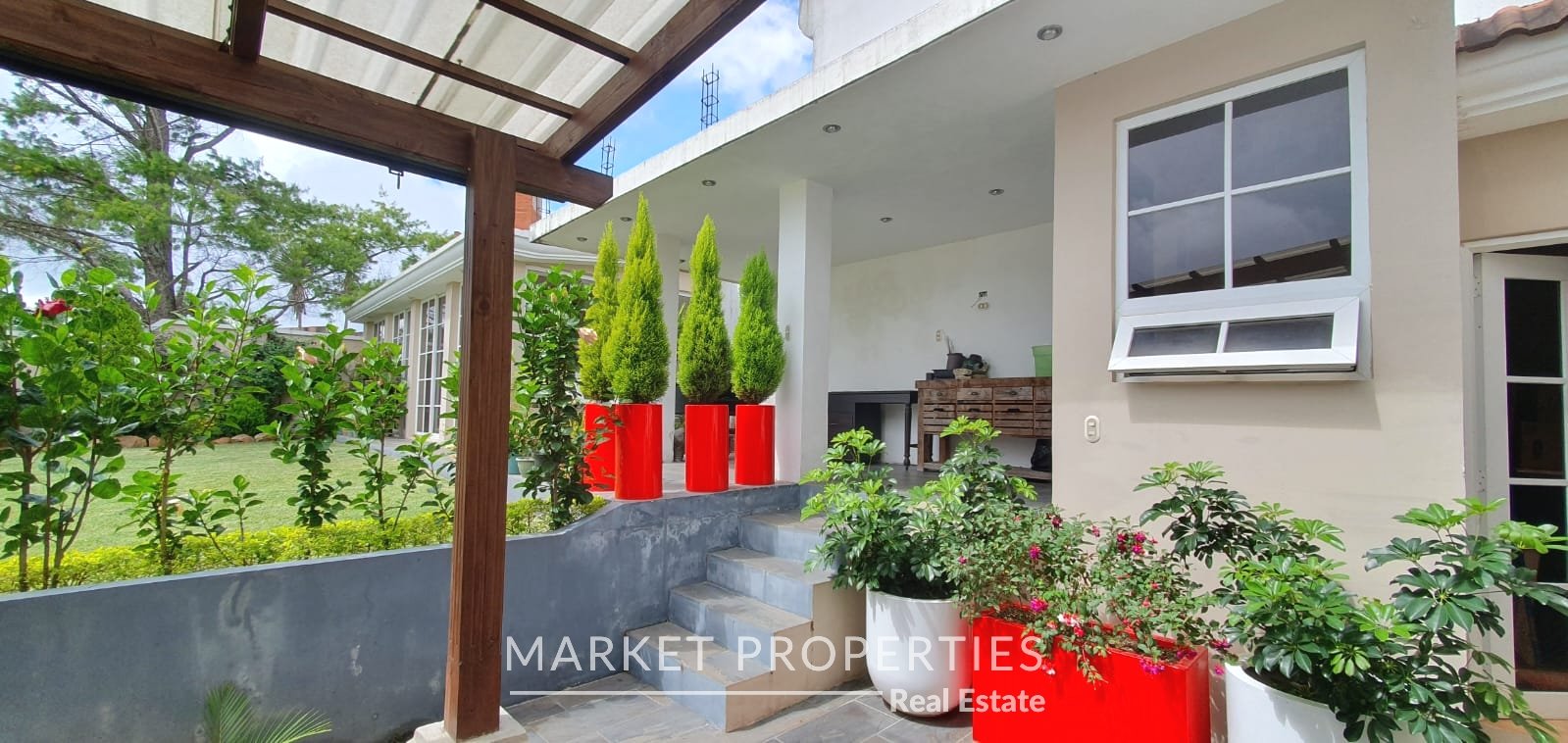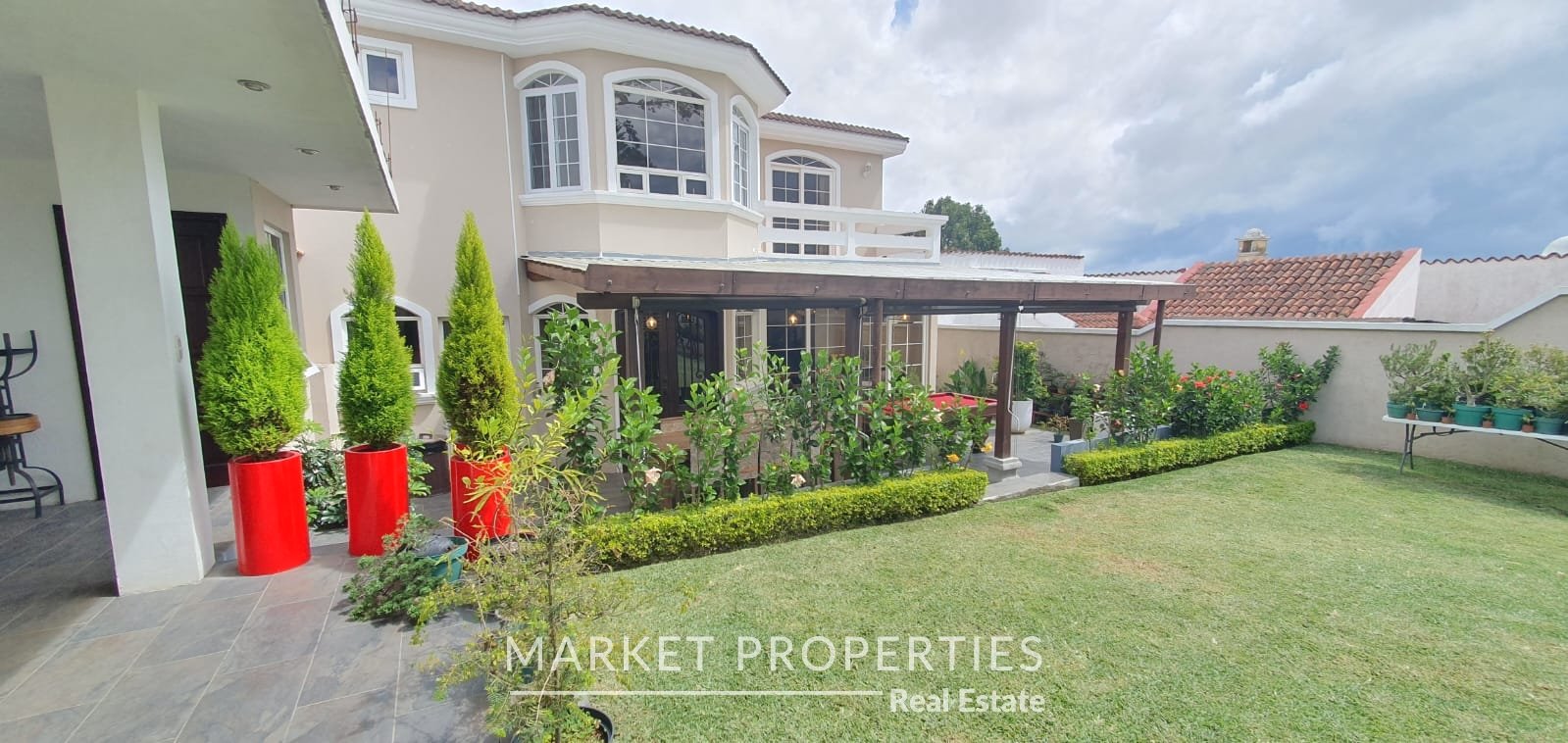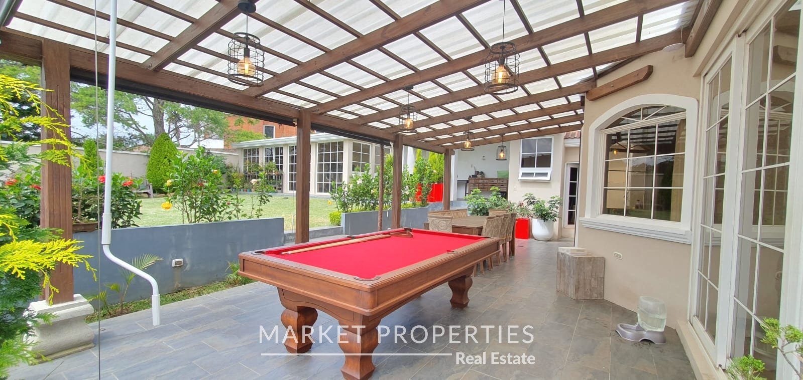 Pérgola grande con salida a un jardín amplio y salón de usos múltiples